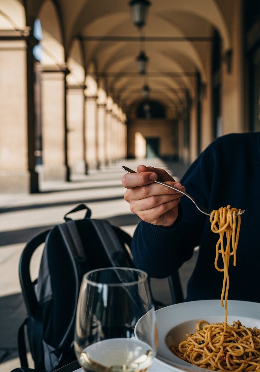 Bologna porticos shelter walks. Tagliatelle €6.