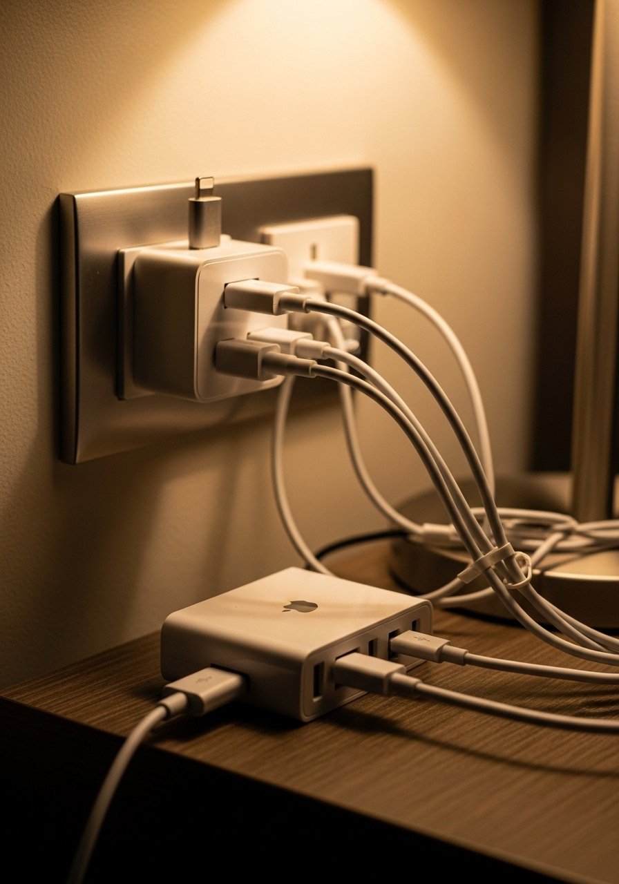 Hotel rooms rarely have enough outlets. A small multiport USB charger lets me charge phone, earbuds, and camera at once from one socket.