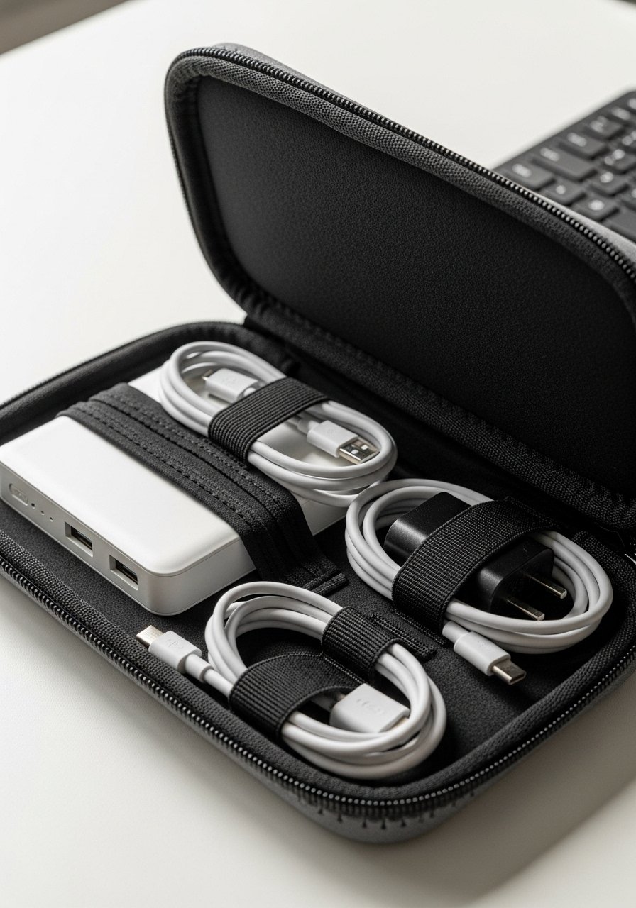 I put chargers, a compact power bank, and spare cable in one small neoprene organizer. Cables stay untangled. When I need to charge, I pull the whole organizer out and set it on a table.